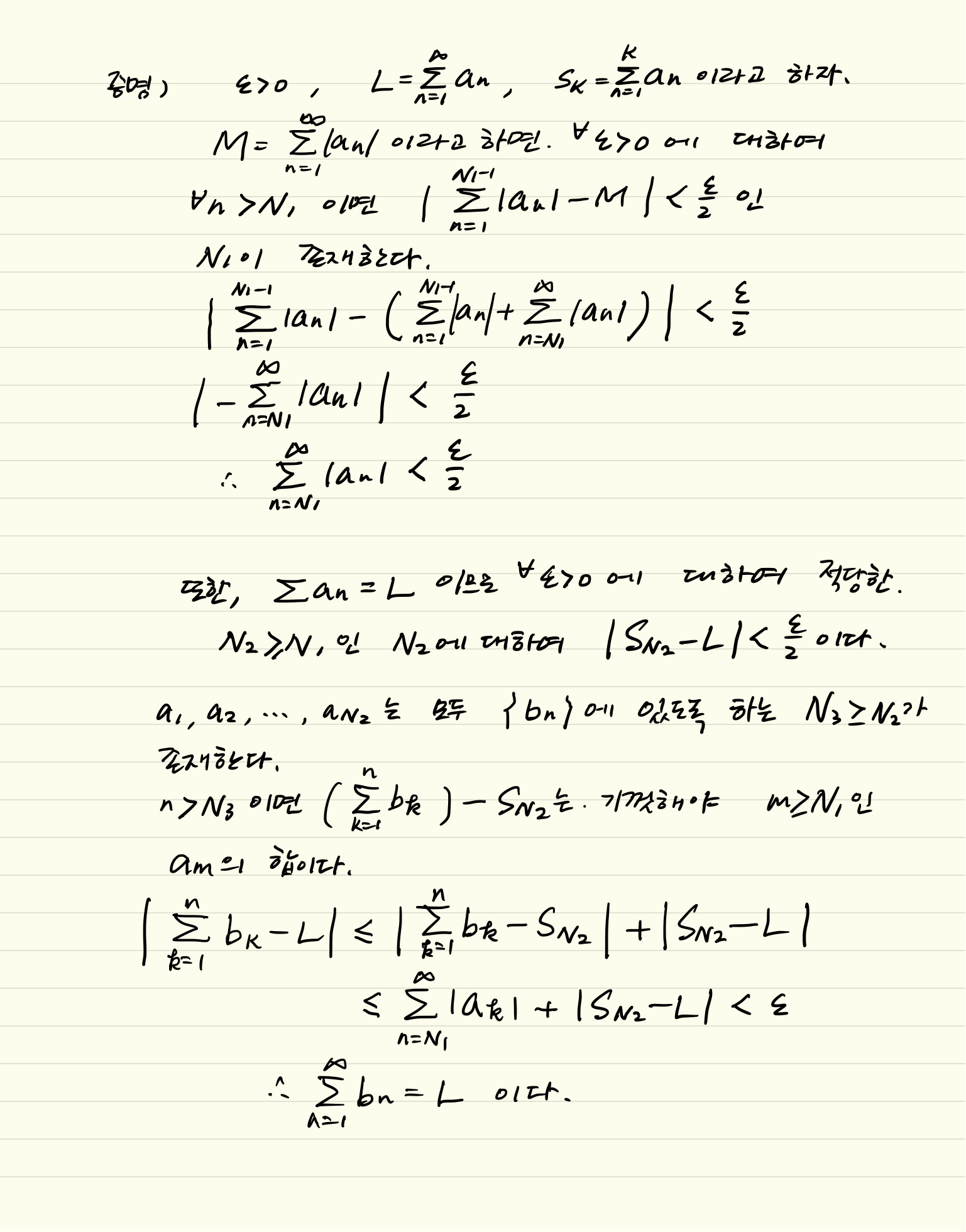 - 급수 $\displaystyle{\sum_{n=1}^{\infty}b_n}$은 급수 $\displaystyle{\sum_{n=1}^{\infty}a_n}$을 재배열한 급수라고 하자. $\displaystyle{\sum_{n=1}^{\infty}a_n}$이 절대수렴이면 $\displaystyle{\sum_{n=1}^{\infty}b_n}$도 절대수렴이고 아래와 같이 극한값이 같다.