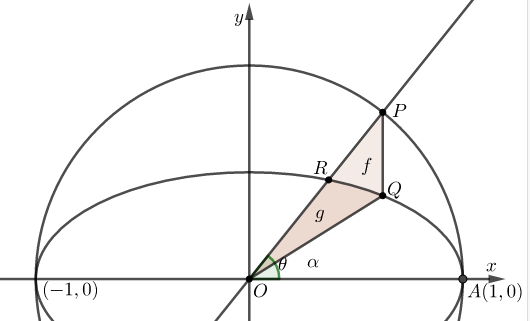 나. 점 $P$와 원점 $O$를 이은 선분이 타원과 만나는 점을 $R$이라고 하자. 선분 $OA$와 선분 $OP$가 이루는 각을 $\theta$, 선분 $OA$와 선분 $OQ$가 이루는 각을 $\alpha$라고 하자. 선분 $PQ$, 선분 $PR$과 타원의 호 $RQ$로 둘러싸인 도형 $PQR$의 넓이를 $f$, 선분 $OQ$와 선분 $OR$과 타원의 호 $RQ$로 둘러싸인 도형 $QOR$의 넓이를 $g$라고 하자.