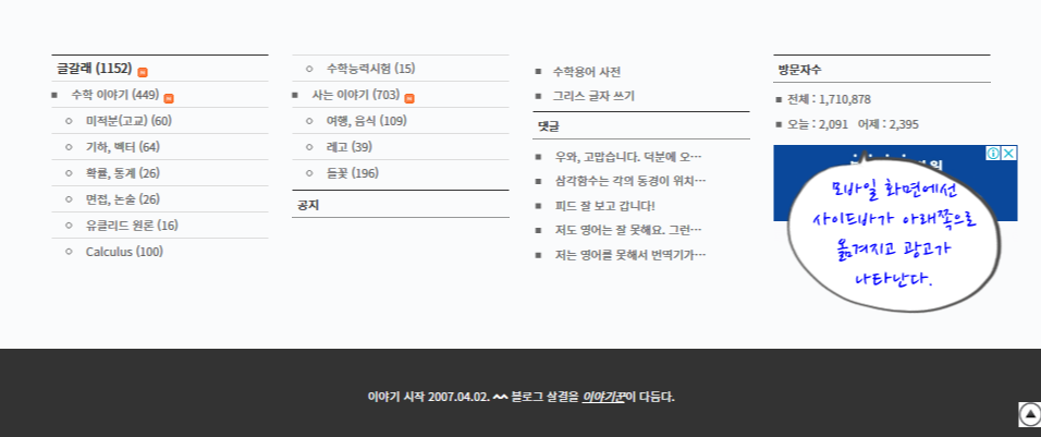 이전에 공개했던 수학 이야기 스킨을 바꿔서 2단으로 만들었다. 요즘은 1단 스킨이 대세지만 사이드바가 드러나 있는 2단 스킨도 나름 쓸모가 있다. 블로그에 수식을 자유롭게 쓰려고 스킨을 스스로 만들어 쓰기 시작했는데 요즘은 광고를 보기 좋게 배치하려고 스킨을 고쳤다. 자동 광고 기능을 써보니 광고가 글을 읽는 걸 방해할 때가 있어서 맘에 들지 않는다.