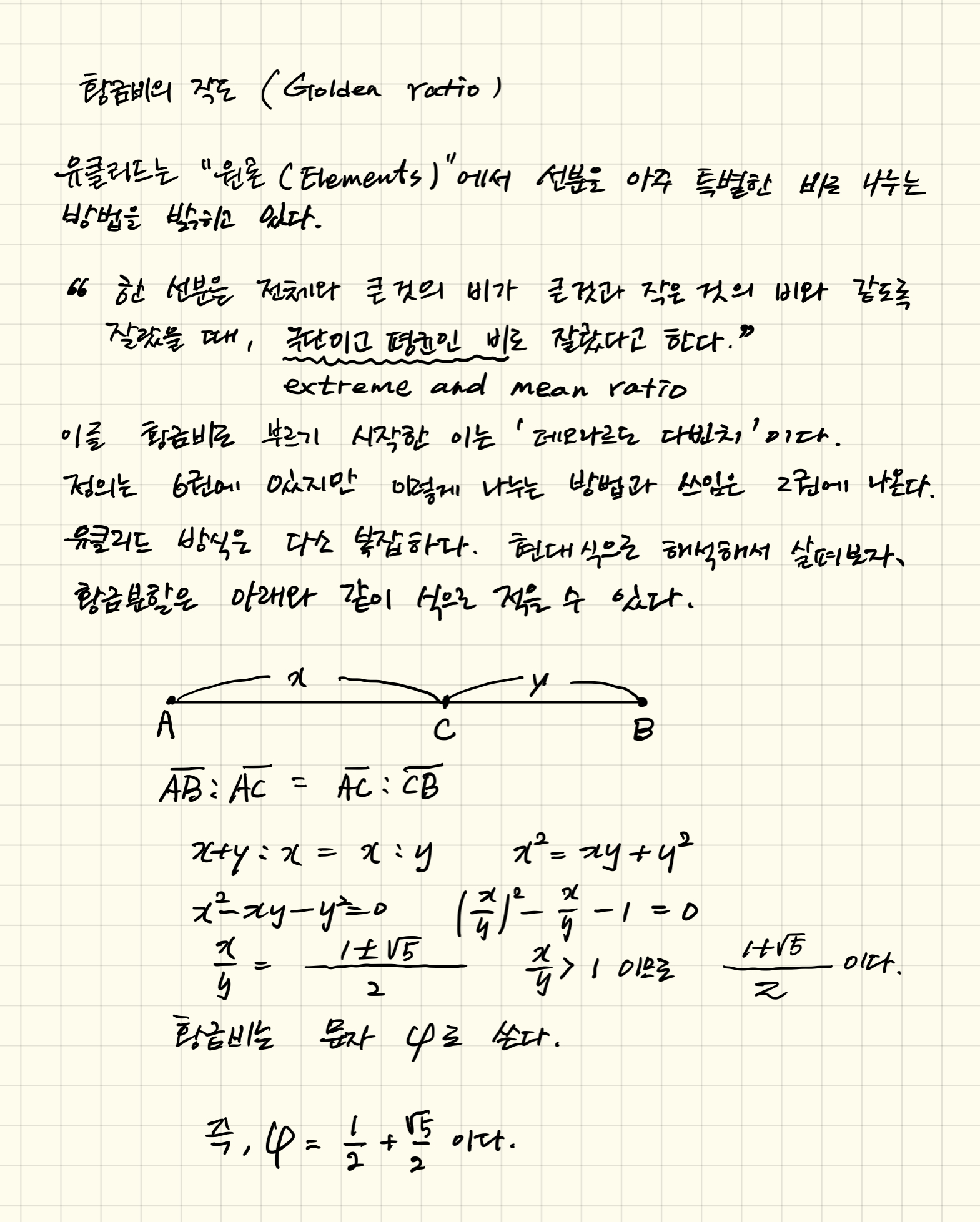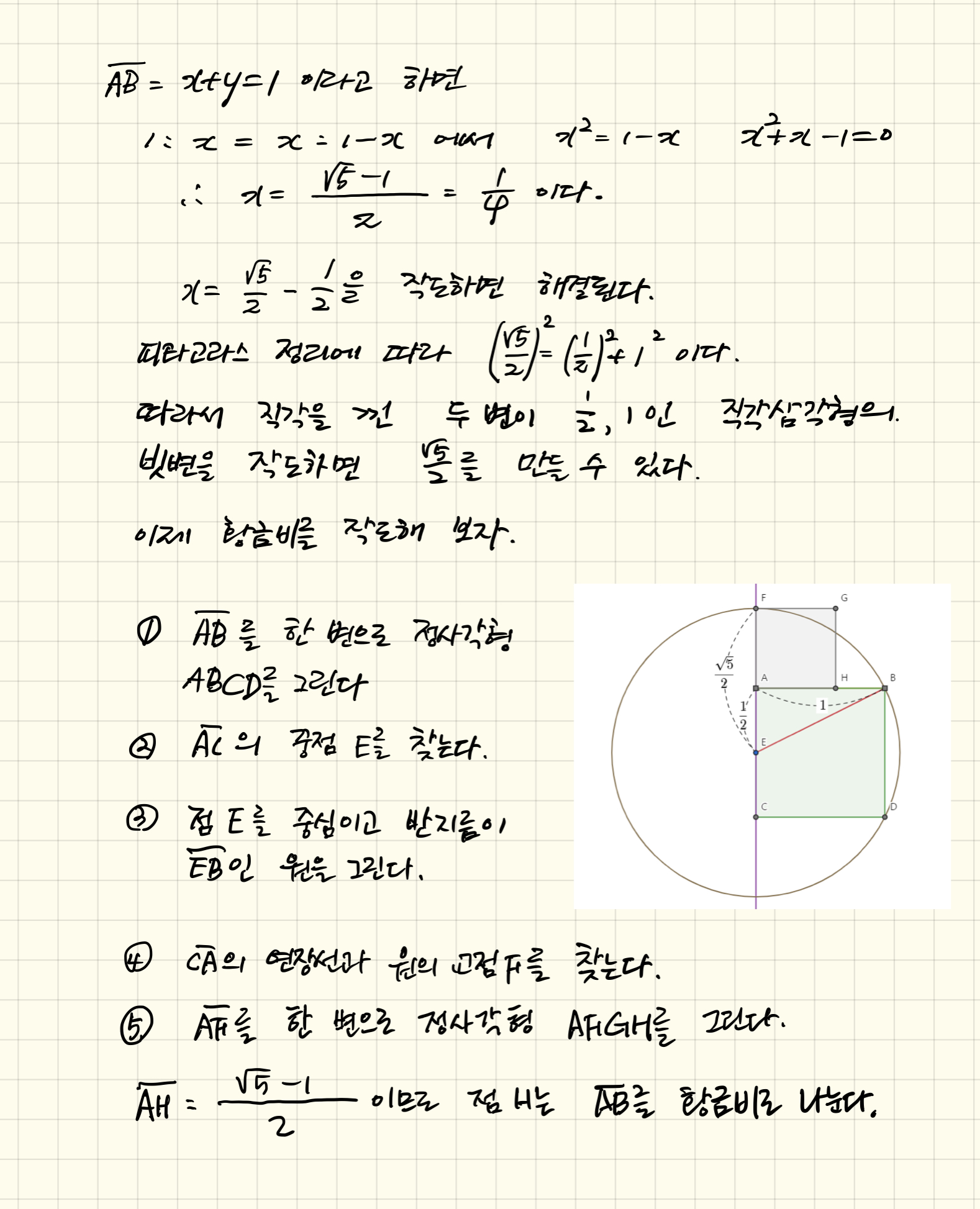 수학이야기/중학수학3 2021. 7. 7. 12:27정오각형의 작도를 이야기할 때 자연스럽게 황금비가 나오기 마련이다. 황금비에 관해 예전에 쓴 글도 있지만 다시 정리해 본다. 이번에는 손글씨로 적어 본다.