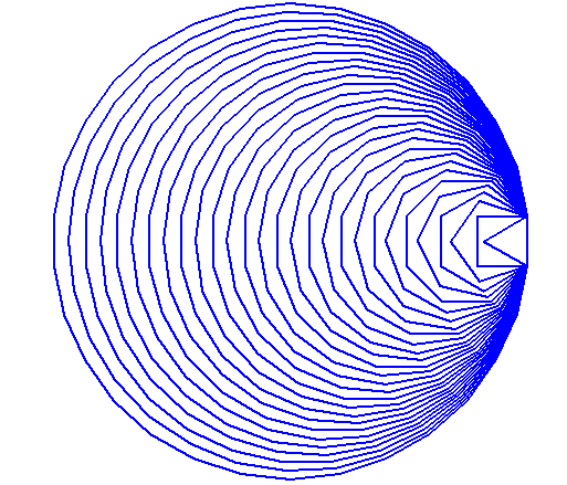 아래 그림은 $n=3$부터 $n=30$까지 정$n$각형을 차례대로 그렸다. 보이는 대로 점점 둥글어진다. 마지막 정 30 각형은 원이라고 해도 믿을 것이다. 사실 완벽한 원은 실제로 존재하지 않는다. 옛날 사람들은 완전한 원에 가까운 바퀴를 만들기 위해 노력했다.