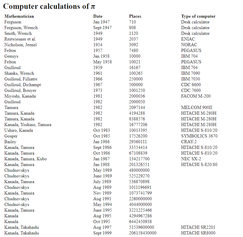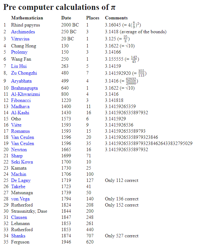 1873년 윌리엄 샹크스(William Shanks)는 15년에 걸쳐 707자리까지 계산했으나 나중에 계산해 보니 불행하게도 527자리까지만 맞고 528자리부터는 틀렸다.