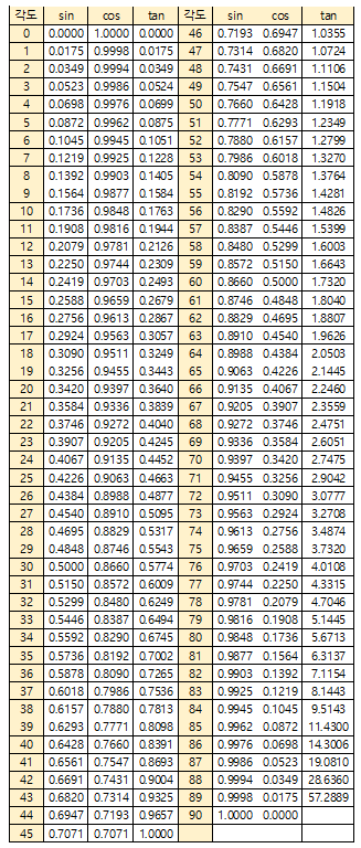 수학이야기/중학수학3 2023. 9. 6. 13:02시험문제 낼 때 삼각비표를 첨부하려고 찾다가 그냥 만들어 보았다. 엑셀에서 수식으로 만들고 복사하여 한글에 붙여 넣었다. 엑셀에는 각의 크기를 나타내는 기호 ${}^{\circ}$를 넣지 않았다.