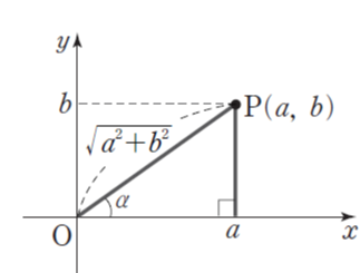 그림과 같이 좌표평면 위에 점 $P(a,b)$를 잡고, 동경 $OP$가 $x$축 양의 방향과 이루는 각의 크기를 $\alpha$라고 하면 $\overline{OP}=\sqrt{a^2 +b^2}$이다.