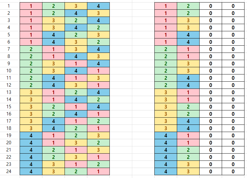 $1,\,2,\,3,\,4$로 만들 수 있는 네자리 자연수는 $4!=24$이다. 이때 십의 자리와 일의 자리를 모두 0으로 바꾸면 1234와 1243은 모두 1200이 되어 구별이 사리진다. 아래와 같이 $2!=2$로 나눈 $12$가지 된다.