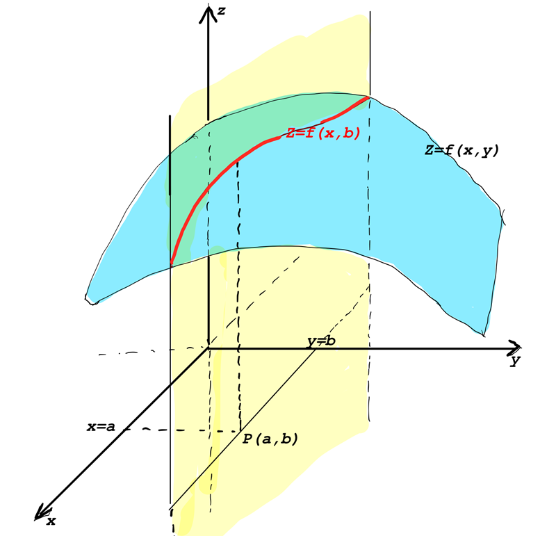 함수 $z=f(x,y)$의 그래프는 곡면이다. 곡면 $z=f(x,y)$가 평면 $y=b$와 만나는 곡선은 $z=f(x,b)$이다. 여기서 $z=f(x,b)$는 변수 $x$의 1변수 함수이다. 이 함수가 $x=a$에서 미분가능하다고 하자. 이때, 극한값