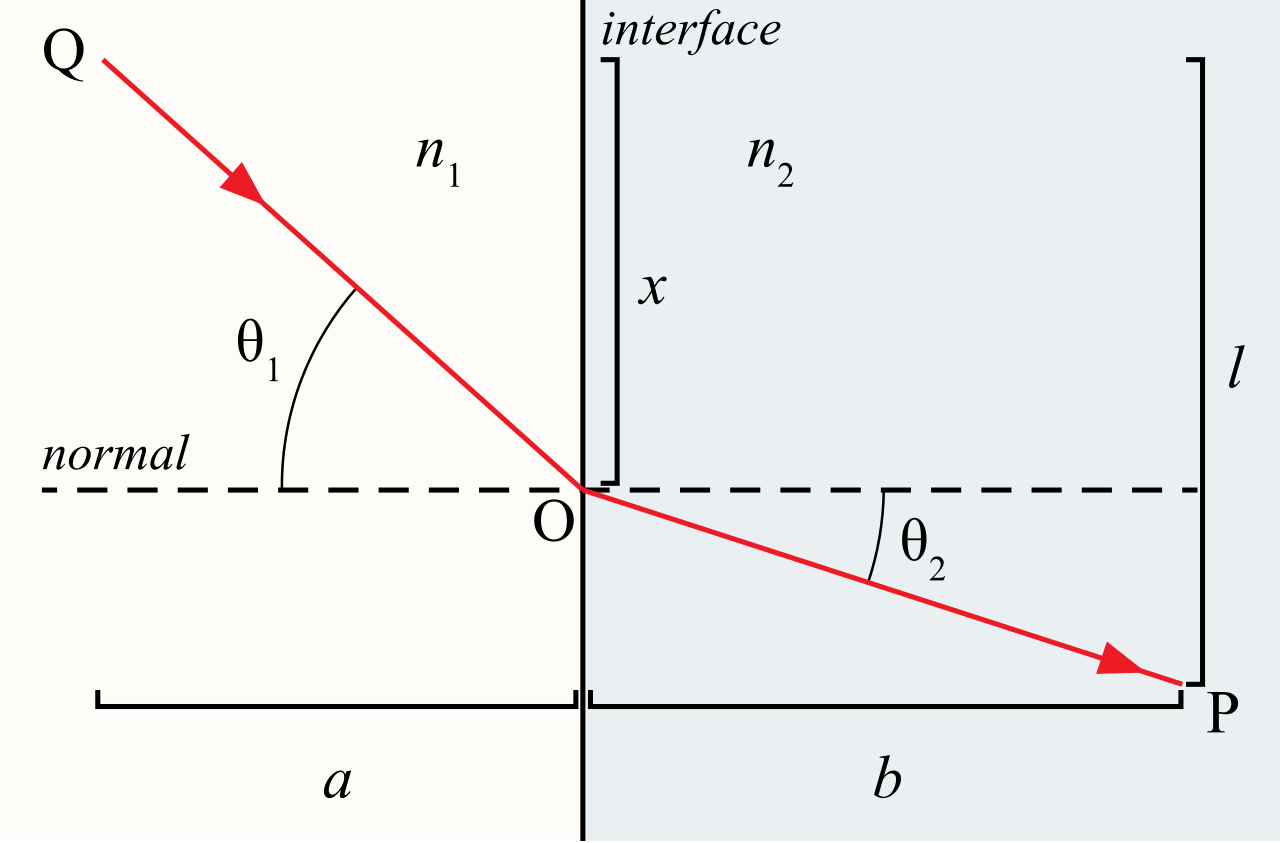 빛이 매질medium 1에 있는 점 $Q$를 출발하여 굴절refractive되어 매질 2에 있는 점 $P$에 도착한다고 하자. 매질 1과 2에서 굴절률refractive index을 각각 $n_1$ and $n_2$이라고 하자. 빛은 경계에 있는 점 $O$를 지나 매질 2로 들어간다고 하자.