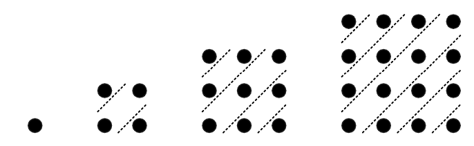 \begin{split}1\\1+2+1=2^2\\1+2+3+2+1=3^2\\1+2+3+4+3+2+1=4^2\end{split}